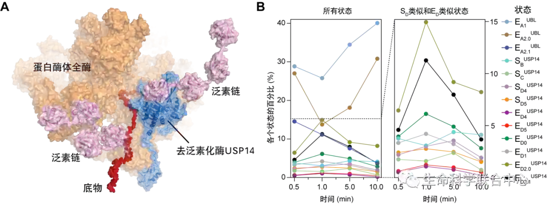 图1.(A)USP14调控下蛋白酶体复合体降解多泛素化底物的原子结构模型之一。(B)时间分辨率冷冻电镜解析13种中间态的统计分布随蛋白质降解进程的时间演化。(图片来源: YoudongMao, CC BY 4.0)
