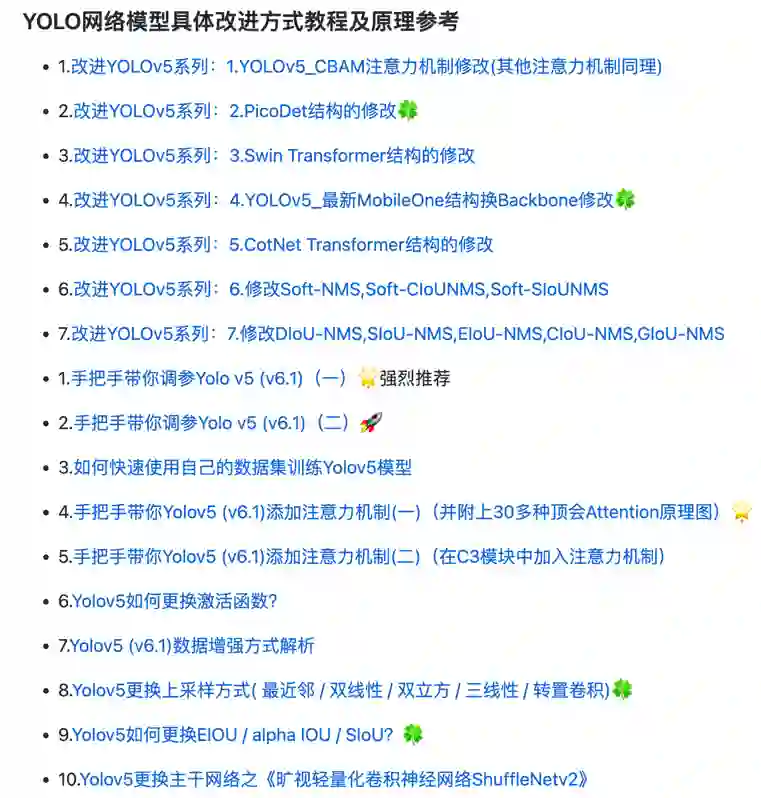 Backbone、Neck、Head、注意力机制、IoU 损失函数、多种 NMS、Loss 损失函数、自注意力机制系列、数据增强部分、激活函数等部分