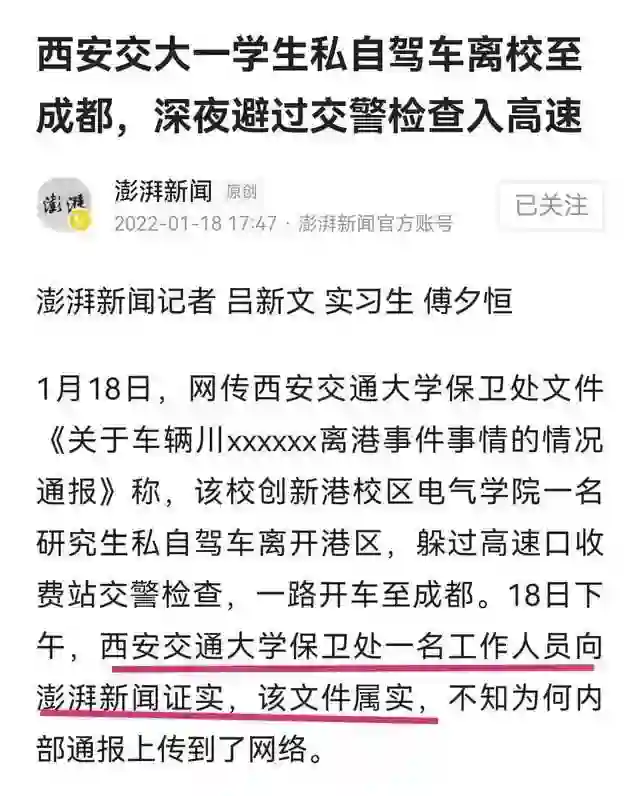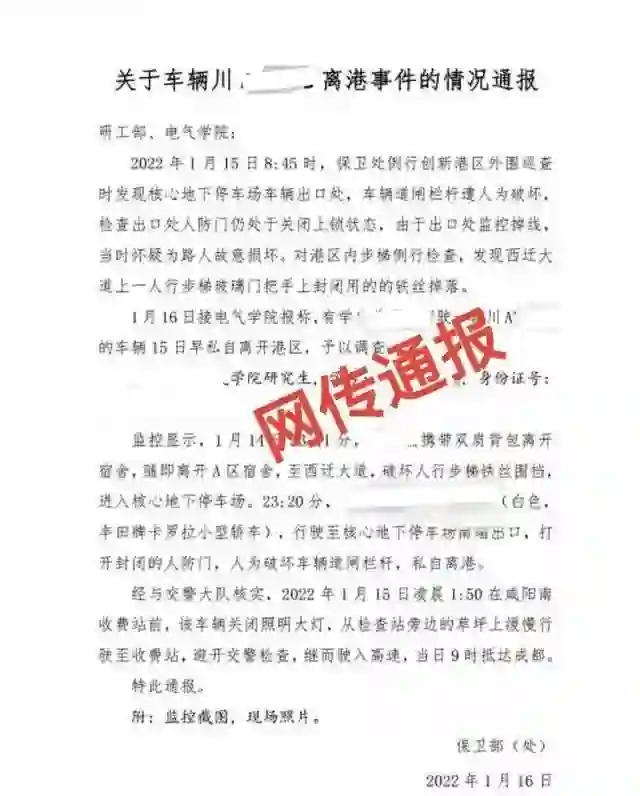 1月18日,网传西安交通大学保卫处文件《关于车辆川xxxxxx离港事件事情的情况通报》称,