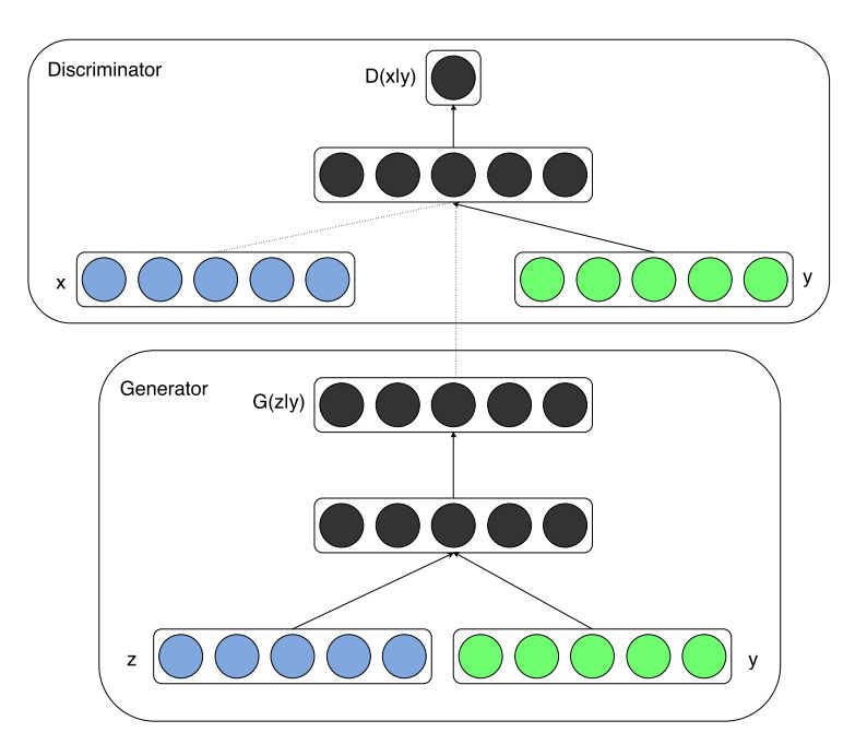 Conditional GAN 架构:除了随机噪声向量 z 之外,类标签 y 被连接在一起作为网络的输入