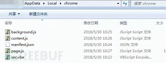 创建Chrome文件夹并在其中创建名为sec.vbe,manifest.json,background.js,content.js,page.js的脚本文件。