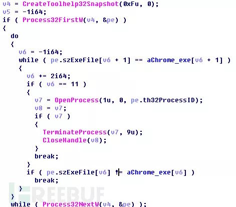 DLL恶意代码执行后会查找Chrome进程,如果当前Chrome进程正在运行,则结束掉Chrome进程,然后以静默的方式释放安装Chrome.crx插件包,进一步达到劫持用户比特币交易接受地址,窃取用户facebook社交帐号和利用社交帐号进一步分享恶意的chm文档传播的功能。