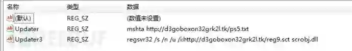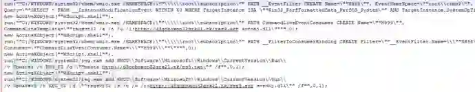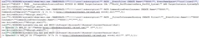 远程脚本reg9.sct会在系统中添加两个启动项,ps5.txt为一个Html页面,其中夹杂混淆的vbs脚本代码,reg9.sct启动项保证其自身远程脚本逻辑每次开机执行,并结合wmic展开持久性攻击。