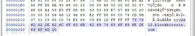 对Shellcode解码可知与文章开头的tmpg.Jpg中的Shellcode代码相似度极高,依然会尝试读取网络文件,不同点是隐藏在Shellcode尾部的域名改为了ssl2.blockbitcoin.com,分析时测试该域名已暂时无法解析,不排除以后病毒团伙会再次启用。