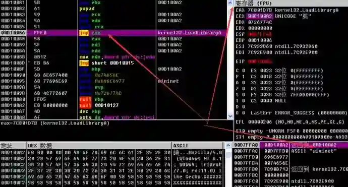 Shellcode代码通过遍历LDR链找到kernel32模块,然后获取LoadLibraryA的地址,加载Wininet模块,然后获得一系列网络操作函数