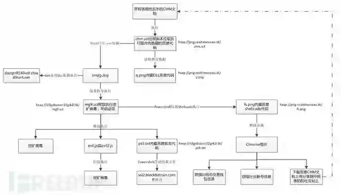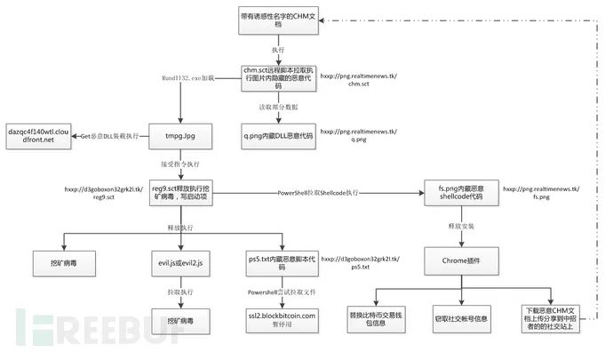 病毒目前行为主要有释放挖矿病毒,安装Chrome浏览器恶意插件,在用户交易虚拟加密币时劫持收款地址,盗取用户facebook帐号信息,并自动在facebook网站分享若干“小黄书”chm下载链接实现蠕虫式的传播。