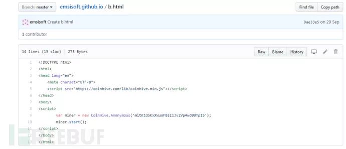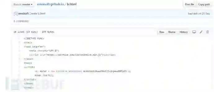通过关联到的往期病毒相关信息,对js挖矿页面的溯源发现,该网站是github申请的个人网站,在该项目中,发现b.html同样是JS挖矿。