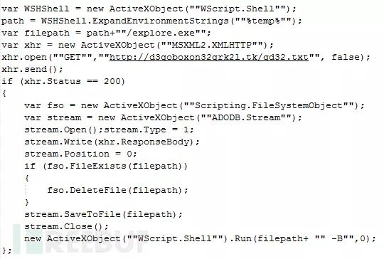 之后reg9.sct脚本通过访问hxxp://d3goboxon32grk2l.tk/gd32.txt 或者gd64.txt链接获取文件流数据然后再本地temp目录创建启动一个名为explore.exe的进程,其中会判断系统版本进一步适配x86或x64的对应程序。