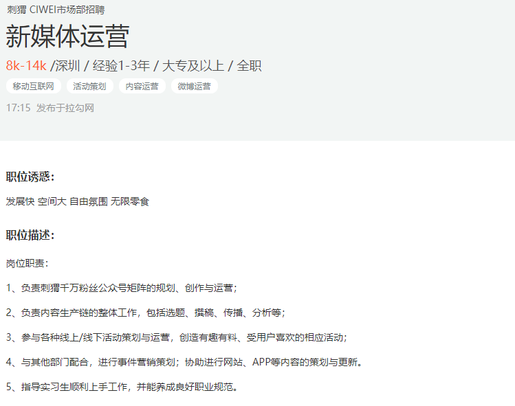 新媒体岗位显然已经成为高薪岗位,我们可以直接来看看招聘网站上关于新媒体运营岗位的情况。