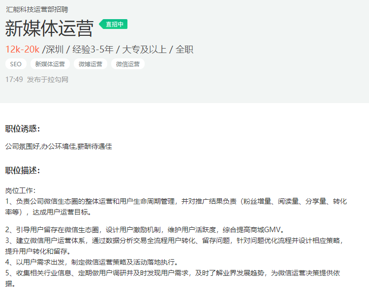 以专做互联网招聘的拉勾网为例,运营类岗位中,他们已经把新媒体运营放在二级菜单首位显示。