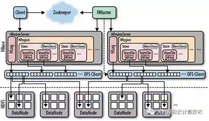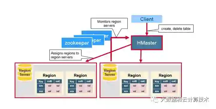并实时通知给HMaster,存储HBase的schema和table元数据,默认情况下,HBase 管理ZooKeeper 实例,Zookeeper的引入使得HMaster不再是单点故障。一般情况下会启动两个HMaster,非Active的HMaster会定期的和Active HMaster通信以获取其最新状态,从而保证它是实时更新的,因而如果启动了多个HMaster反而增加了Active HMaster的负担。如图:
