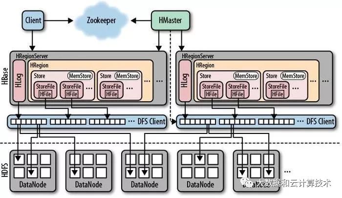 注:一般而言,Master和NameNode在一台服务器上,RegionServer与DataNode在同一个服务器上。