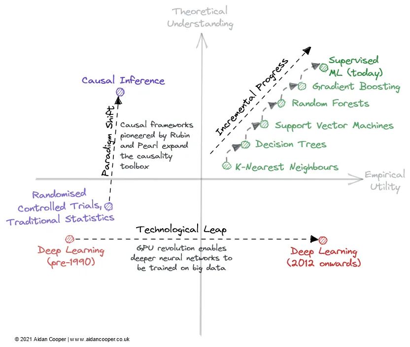 在这个框架内科学进步的最终机制是范式转变。正如托马斯 · 库恩(Thomas Kuhn)在他的著作《科学革命的结构》中所指出的,范式转变代表了科学学科的基本概念和实验实践的重要变化。Donald Rubin 和 Judea Pearl 开创的因果框架就是这样一个例子,它将因果关系领域从随机对照试验和传统统计分析提升为更强大的数学化学科,形式为因果推理。范式转变通常表现为理解的向上运动,这可能会跟随或伴随着效用的增加。