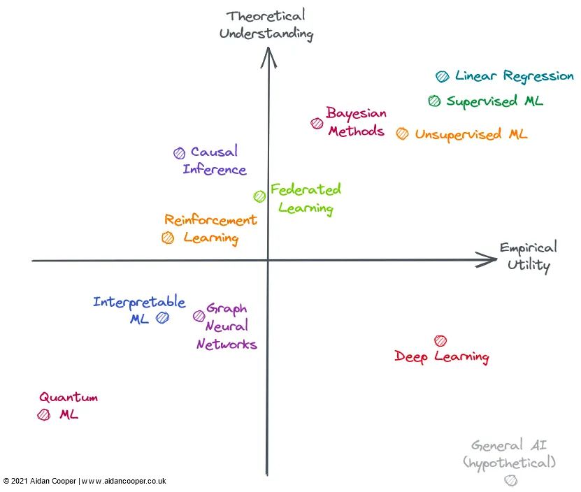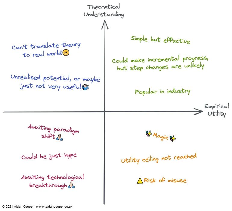一般来说,我们期望效用和理解是松散相关的,使得理论理解程度高的方法比理解程度低的更有用。这意味着大多数领域应位于左下象限或右上象限。远离左下 - 右上对角线的领域代表着例外情况。通常,实际效用应落后于理论,因为将新生的研究理论转化为实际应用需要时间。因此,该对角线应该位于原点上方,而不是直接穿过它。