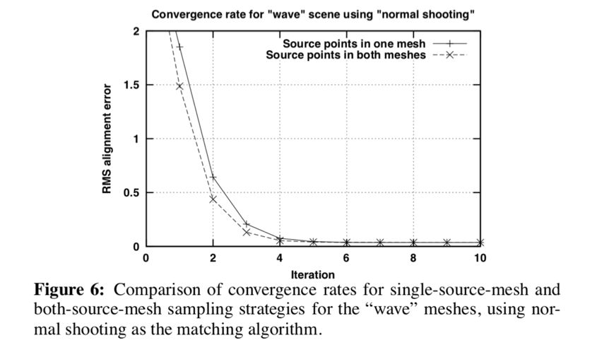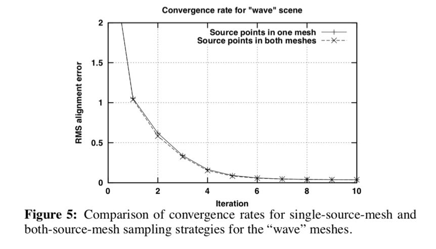 我们将从两个网格上分别取点和从一个网格选点进行对比优势。对于“波浪”测试场景以及基础算法,差距微小(见图5)。然而其中一部分原因是因为使用的是匹配共同最近点算法(见3.2章),两个网格是相对称的。如果使用一个“非对称”算法,如投影或者法相射线(见3.2章)可以看到从两个网格取点有略微优秀一些(见图6),尤其是在开始迭代时两个网格差的较远时。此外,我们认为在网格重叠部分很小或者网格上有漏洞的时候,从两个网格上取点结果会更优。