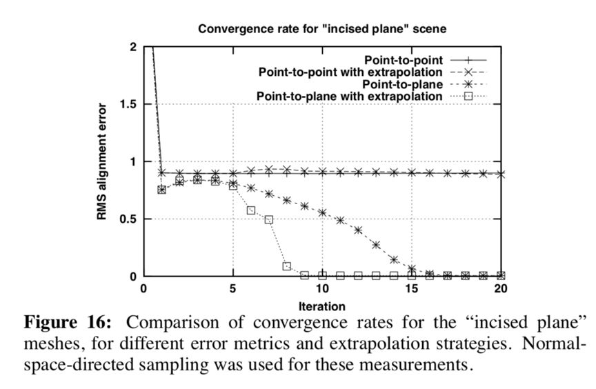“分形地貌”场景中,我们可以看到即使使用外推法,点到平面的度量误差要远优于点到点的度量(图15)。在“刻痕”场景中,差距就更加明显(图16)。这里点到点的度量就无法得到正确解,因为使用点到点的误差度量无法轻易的使两个平面产生滑动。
