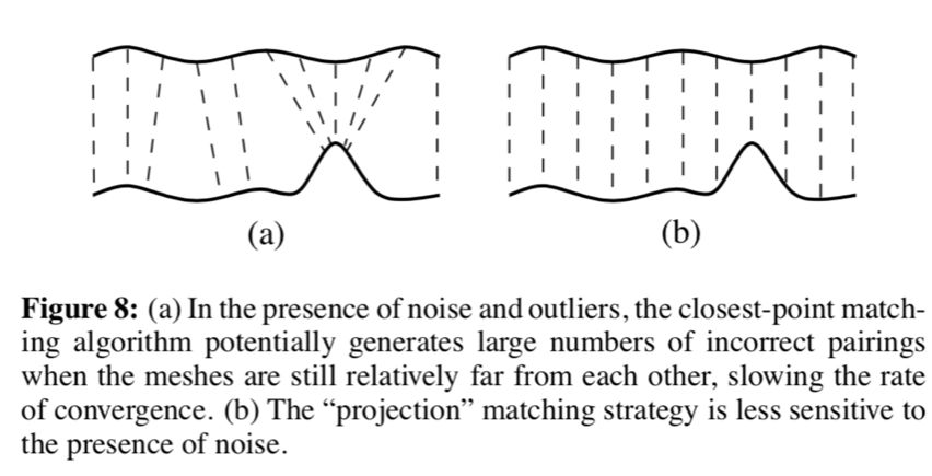 首先看“划痕”场景的表现(图7)。对于这样的场景,与投影算法相比,法相射线方法会给出更优的结果。临近点算法相应表现差强人意。我们猜想是因为最近点算法对噪声更加敏感并且比其他算法得到更大量的错误的配对(图8)。