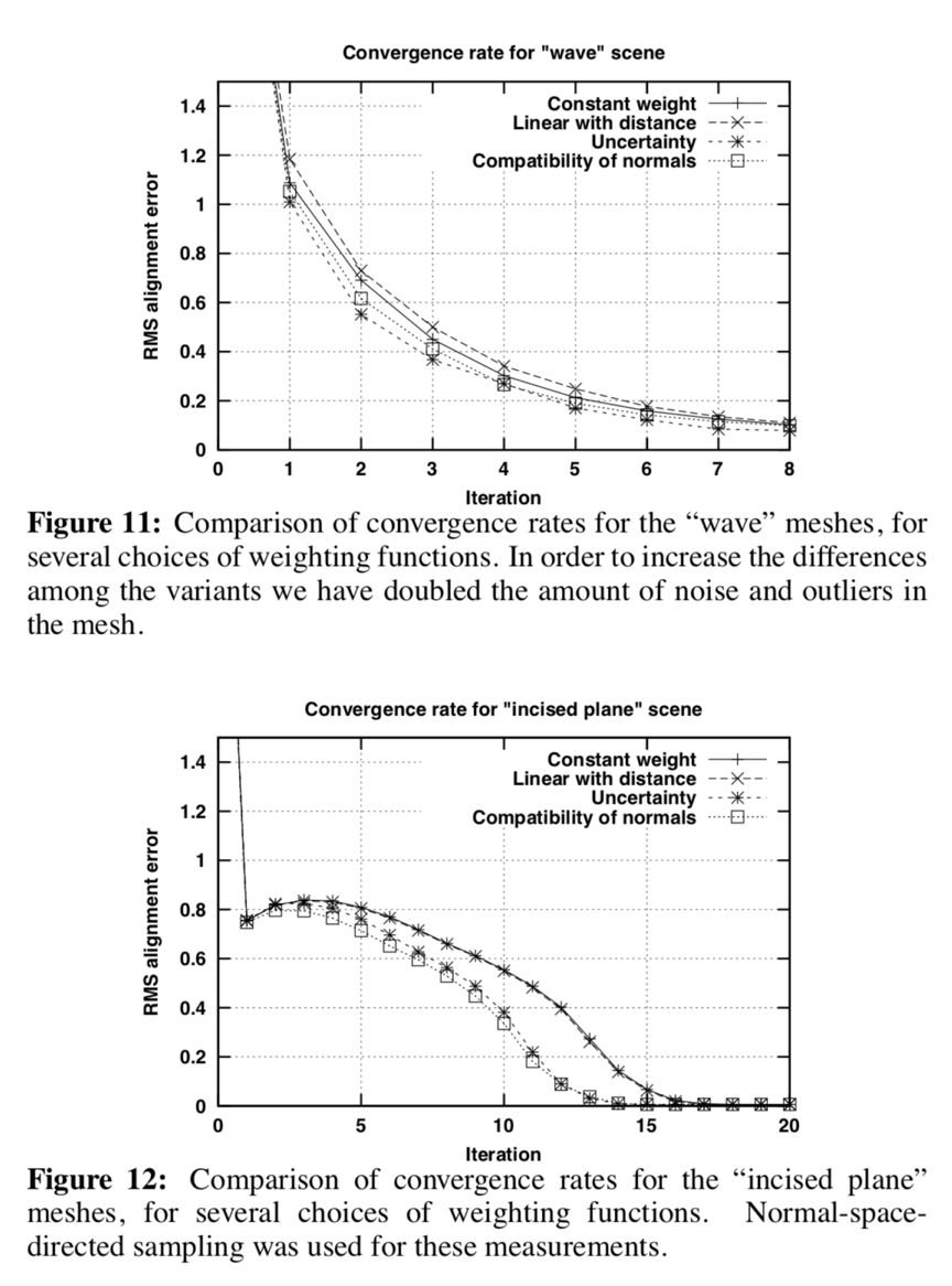 我们首先看“波浪场景”(图11)。我们引入过更多的噪声来更明显的看出变种算法间的差别。可见,在加入噪声时,所有的权重策略结果都是相似的。只有“uncertainty”和“compatibility of normals”会稍微优于其他方法。但是对于“刻痕”场景(见图12),结果相差不多,尽管表现差距较大。我们会慎重诠释这个结果,因为模型上点的法向量不指向扫描仪的时候,基于不确定性的方法给该点分配的权重更高。因此,在这个场景中,刻痕内部的点的权重更高。这就使得收敛速度大幅增加。总之,权重的选取对收敛速度的效果微小并且高度依赖数据。而且权重的选择依赖于其他因素,例如最终结果的精度。