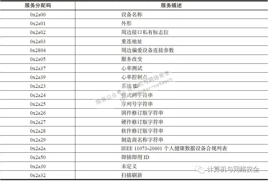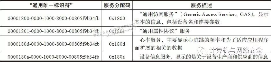 “通用唯一标识符”信息是从上面带有“--characteristics”参数的“特性扫描”返回的。显示的格式和前面“主要服务”信息格式一样,同样是以16位的值作为“服务分配码”。这个特性模式下的“服务分配码”和“服务描述”显示如表2所示。为了格式的紧凑、节省显示的空间,其中“通用唯一标识符”这一列已删除掉了。