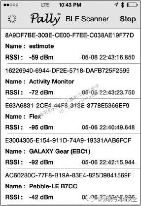 图3 基于iOS系统的“低功耗蓝牙”扫描器的扫描结果