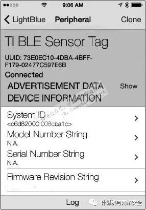 “基于iOS系统的‘低功耗蓝牙’扫描器”可以提供“可发现的”节点的基本信息,但却无法读取到该蓝牙设备上与所提供服务有关的更多信息。一个可选的iOS系统上的app应用程序名叫LightBlue,这款程序是通过“低功耗蓝牙发布的“通告信息”读到“信号强度”信息,并列举了“设备属性”,如图4所示。