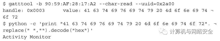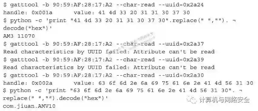 有了“主要服务”信息,您可以继续评估目标设备,通过“--char-read”参数,可以拿到与每一个“通用唯一标识符”关联的信息。其显示效果如下所示: