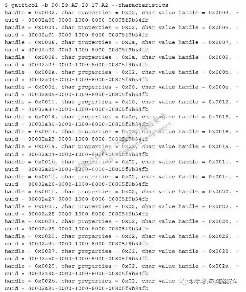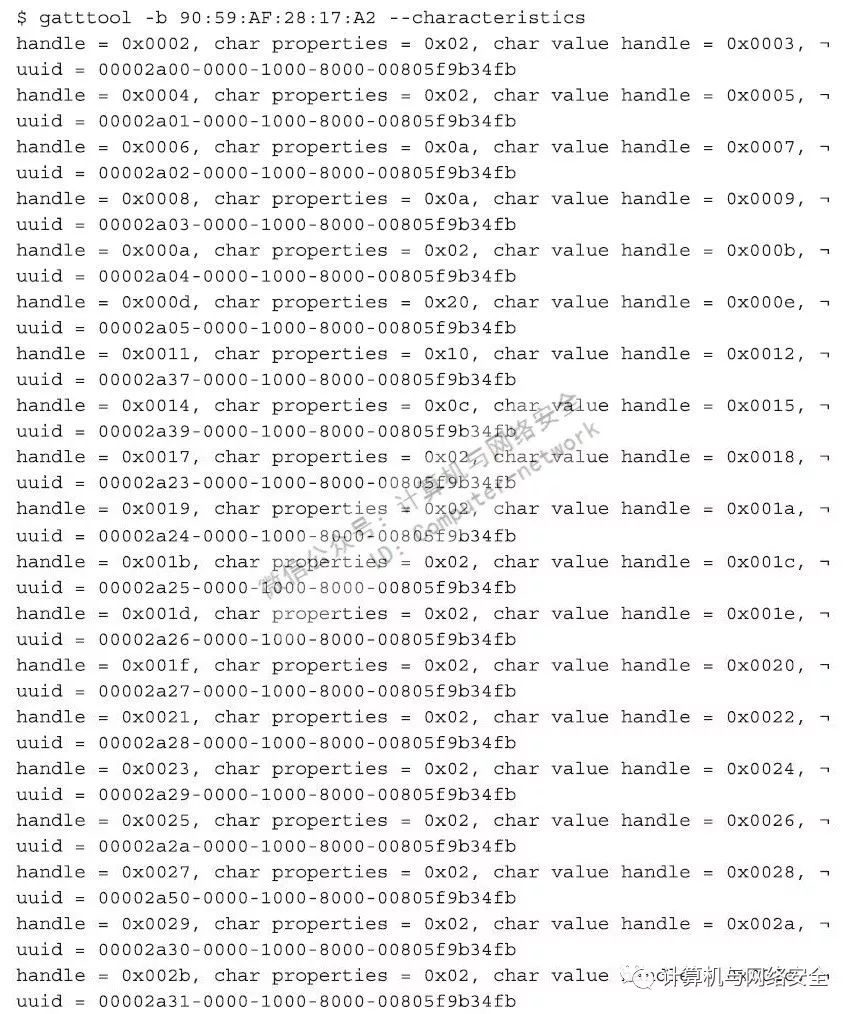 除了“主要服务”信息,还可以识别目标设备的“服务特性”信息(service characteristic)。命令跟上面的命令一样,不过要获取服务特性,就不能使用“--primary”参数了,因为这个参数是读取服务信息,而要将参数换成“--characteristics”,其格式和效果如下所示: