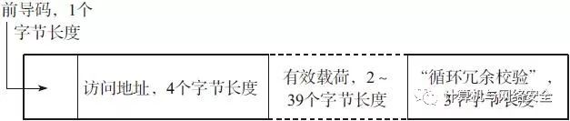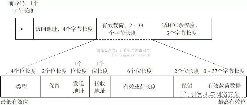 “低功耗蓝牙”使用有限的“有效载荷”(payload)的大小作为其整体节能策略的一部分,该“有效载荷”的长度为2~39字节。基本的“低功耗蓝牙”数据帧是由“前导码”(preamble)、“访问码”(access code)、“有效载荷”和“循环冗余校验”(Cyclical Redundancy Check,CRC)校验码组成。其中的“访问码”有时称为“访问地址”(access address)。整个结构如下图所示。