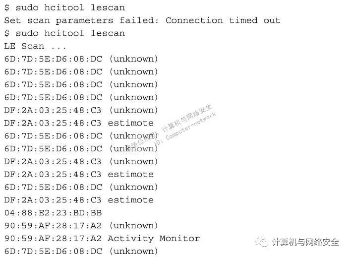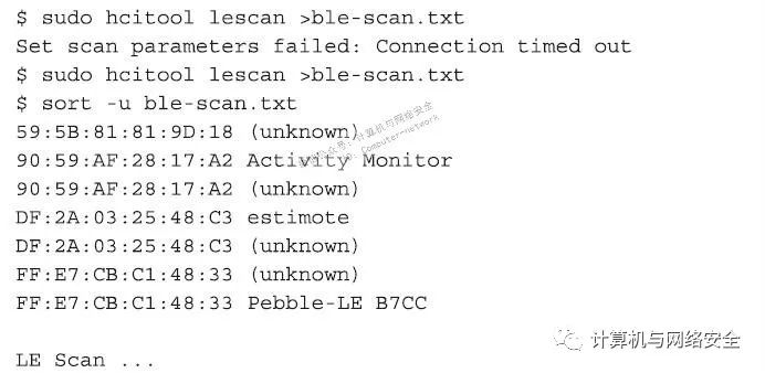 您可以使用BlueZ开发包中的hcitool工具发现处于“可发现的”模式下蓝牙设备的存在状况。在那里,要扫描“基本速率蓝牙”设备和“增强数据速率蓝牙”设备,需要使用一些参数,而在“低功耗蓝牙”的扫描中,不再需要那些参数,而只需要使用“lescan”参数,就可以扫描到这些低功耗的蓝牙设备。这个hcitool工具有个bug,即当您通过使用“lescan”参数使用hcitool命令时,经常会返回一个错误,不用管这些错误,再次重新运行这个命令,有时甚至需要多次重新运行这个命令,才能完成正常的低功耗设备扫描。如下面的例子所示。