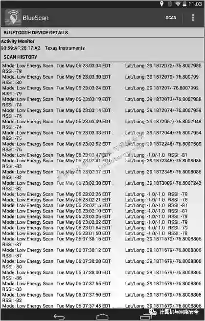 BlueScan软件会记录蓝牙的“设备供应商名称”(这个值是通过MAC地址中的“组织唯一标示符”推算出来的)、“设备类型”(是“双模”类型还是只有“低功耗”类型)、“设备的友好名称”(device-friendly name)和接收到的“信号强度信息”(signal strength information)。在扫描到的结果列表中,单击某个扫描到的设备,可以列出该蓝牙设备的详细信息,包括“设备地址”和“历史扫描结果”(historical scan result),比如观察到的“接收信号强度指示”信息和“全球定位系统”坐标信息,如图2所示。