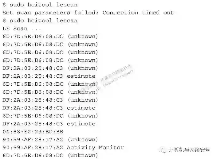 在这个输出结果中可以看到有些设备的重复信息,比如说,“蓝牙设备地址”为90:59:AF:28:17:A2的设备共出现了两次,第一次显示设备名称为“活动力监控器”(Activity Monitor),第二次显示的则是一个“(未知)设备”(unknown)。对于这样的扫描结果,您可以通过“可发现的”设备,借助于“蓝牙设备地址”进行服务枚举的扫描,以便获得更详细、更准确的内容。