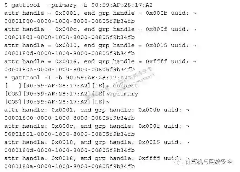 使用Linux操作系统中的BlueZ工具包,包括其中的hcitool程序和gatttool程序,可以通过枚举得到“低功耗蓝牙”设备上可用的服务列表,并可以将这些从设备上提取的数据作为您的侦察和扫描分析的一部分。