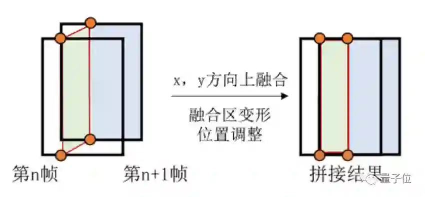 这时,就需要针对存在上下偏移的重叠区域,进行融合区变形,之后再做加权融合,消除竖直方向上的投影偏差。