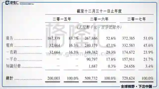 根据招股书显示:宝宝树的收入来源于广告、电商(直销和平台)和知识付费业务。2017 年宝宝树总营收7.30亿元。其中,广告营收为3.72亿元,占比 51.0%;电商营收为3.33亿元,占比45.6%;电商+广告占到了整体业务的97%,剩下的知识付费营收为0.25亿元,占比为3.4%。通过对比2015—2017年的营收情况,能够看到宝宝树的电商业务的占比不断提高,广告有所下滑。