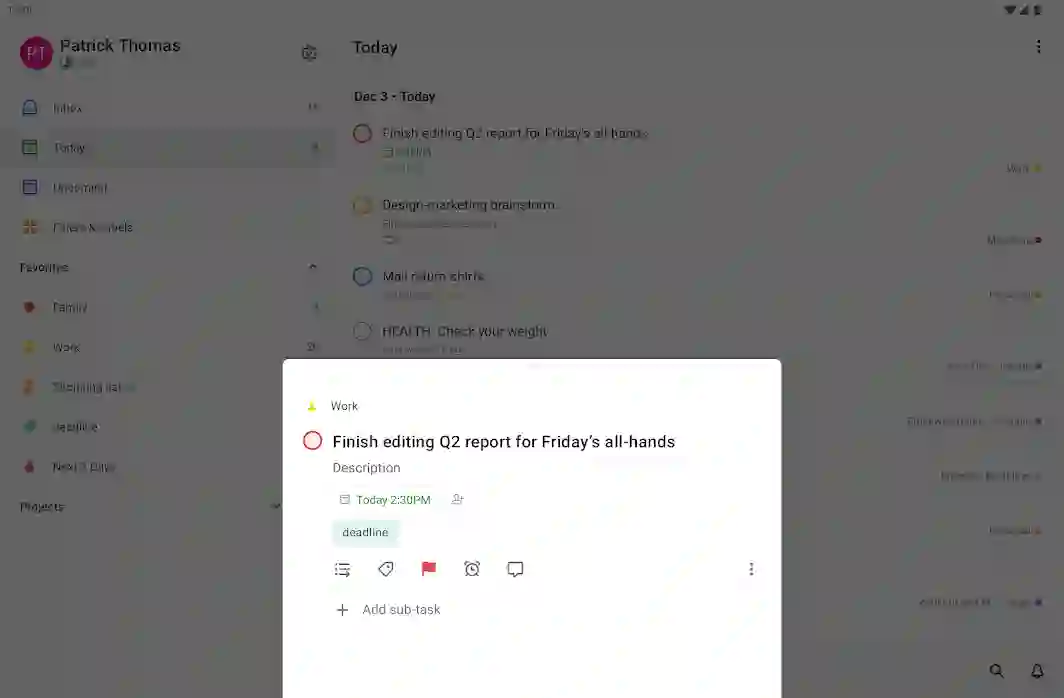 因此,Todoist 对应用 UI 中各种组件加入了更多针对大屏显示的调整:让大屏设备加入更多信息内容显示、基于列表构建的网格布局也让屏幕内容基于尺寸改变显示模式更加方便,尽可能地在大屏幕上利用好额外的屏幕显示空间,保证任务清单等内容有足够的可阅读性,以弹窗的形式呈现任务添加窗口……