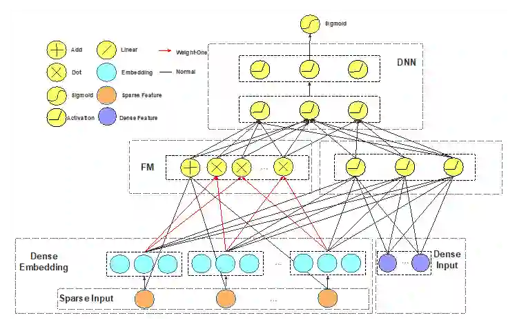 该DeepFM算法与华为设计的DeepFM不同,改模型将FM层的结果作为DNN的输入。