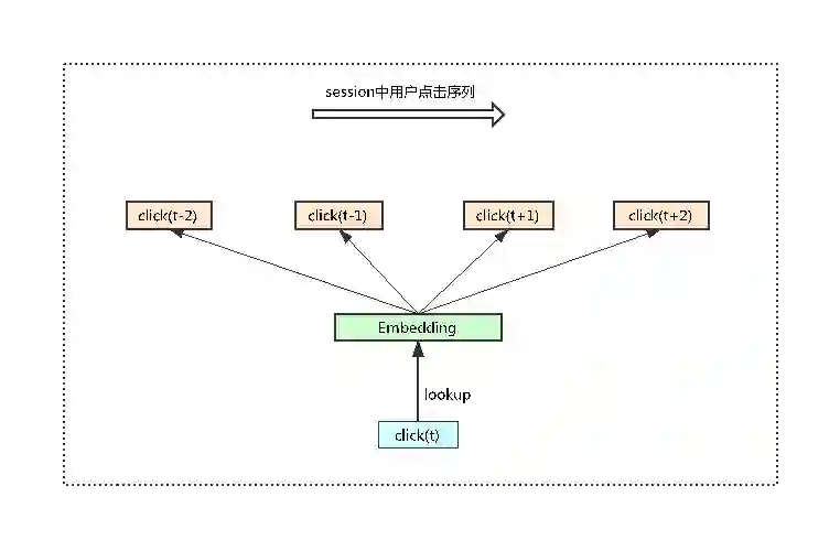 该方法借鉴word2vec的原理,通过“词”去预测“上下文”,这里面的“词”就是itemId,“上下文”就是指在点击该Item事件前后,固定窗口下其他Item的Id信息。