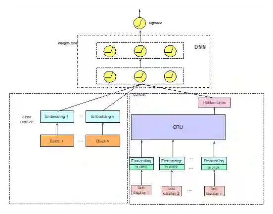 o Last Display 经过 Embedding 后与是否点击结合,再进入 GRU 模块,最后状态当做 DNN 输入;