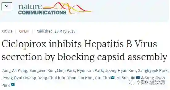 在2019年5月16日《Nature Communications》上发表了一篇名为Ciclopirox inhibits Hepatitis B Virus secretion by blocking capsid assembly的文章。通过筛选了978种FDA批准的化合物,它们能够抑制HBV表达的Hepg2.2.15细胞中的HBV复制,他们发现,环吡咯是一种合成的抗真菌剂,通过阻断乙肝病毒衣壳的装配,可以强烈抑制乙肝病毒在细胞和小鼠中的复制。环吡咯与核苷/核苷酸类似物协同作用,以防止细胞和人源化肝小鼠模型中的HBV复制。