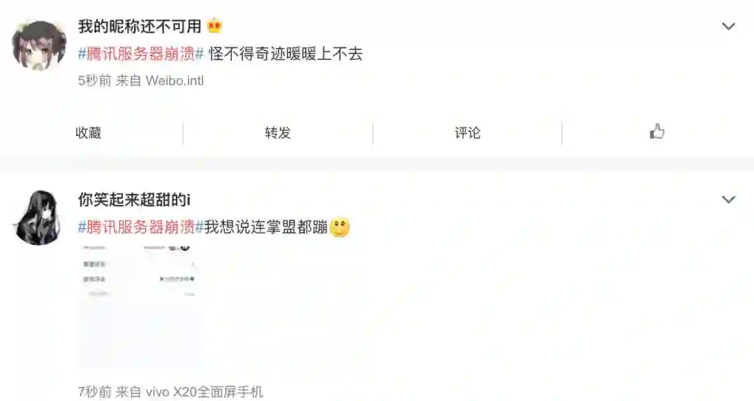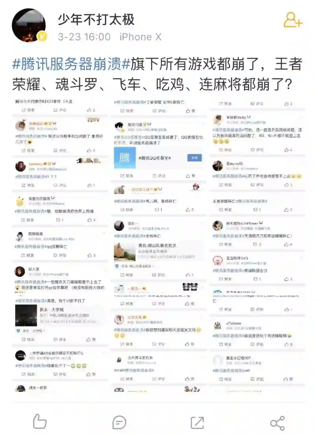 3 月 23 日 16 时左右,腾讯服务器发生了大规模宕机,有网友发微博称旗下《王者荣耀》、《刺激战场》等多款热门游戏和网络服务产品“集体阵亡”。