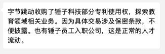 据此,CSDN(ID:CSDNnews)特向字节跳动公司求证,官方回应称,目前字节跳动确实“收购了锤子科技部分专利使用权,探索教育领域相关业务”,此外“也有锤子员工入职公司”,不过这些是“正常的人才流动”,且因为“保密条款”不便透露更多消息。