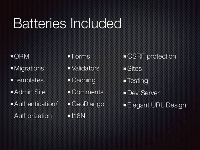 Django基于“自备军需”的理念,您不必使用单独的库来实现常见功能,例如身份验证,URL路由,模板系统,对象关系映射器(ORM)和数据库模型迁移。 如果您正在使用或曾经用过Flask,您一定注意到了它需要调用其他库,如Flask-Login来执行用户身份验证。 Django不是这样。