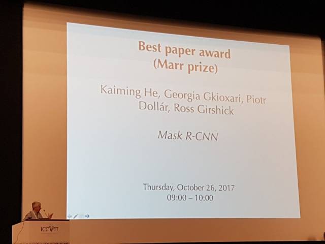 1.ICCV 2017的最佳论文奖(Marr prize)颁发给了Facebook AI实验室(FAIR)何恺明等人的论文《Mask R-CNN》。