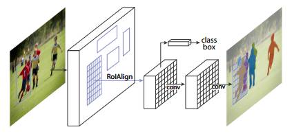 Mask R-CNN 在概念上十分简单:Faster R-CNN 对每个候选物体有两个输出,即一个类标签和一个边界框偏移值。作者在 Faster R-CNN 上添加了第三个分支,即输出物体掩膜(object mask)。因此,Mask R-CNN 是一种自然而且直观的想法。但添加的 mask 输出与类输出和边界框输出不同,需要提取对象的更精细的空间布局。Mask R-CNN 的关键要素包括 pixel-to-pixel 对齐,这是 Fast/Faster R-CNN 主要缺失的一块。