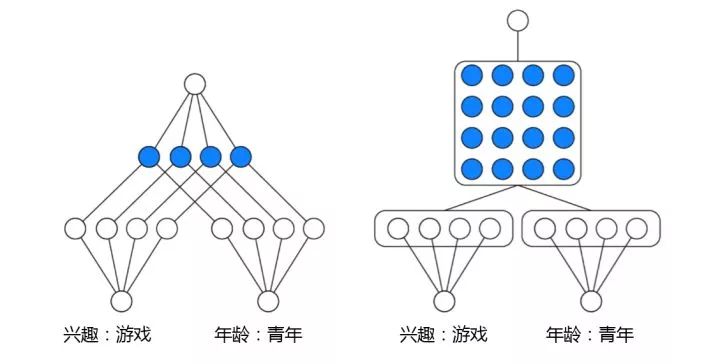 除了 Product Layer 不同,PNN 和 FNN 的 MLP 结构是一样的。这种 product 思想来源于,在 CTR 预估中,认为特征之间的关系更多是一种 and“且”的关系,而非 add"加”的关系。例如,性别为男且喜欢游戏的人群,比起性别男和喜欢游戏的人群,前者的组合比后者更能体现特征交叉的意义。