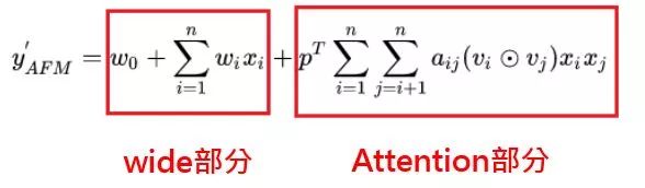 得到 aij 权重后,对各个特征两两点积加权累加后,得到一个 k 维的向量,引入一个简单的参数向量 pT,维度为 k 进行学习,和 Wide 部分一起得到最终的 AFM 输出。