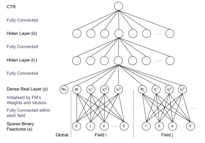 field i 的输入可以表示成 x[start_i: end_i],Wi 为field i 的 embedding 矩阵。z为 embedding 后的向量,是一个 k 维的向量,它由一次项 wi ,二次项 vi=(vi1,vi2,…vik) 组成,其中 k 是 FM 中二次项的向量的维度。而后面的 l1,l2 则为神经网络的全连接层的表示。